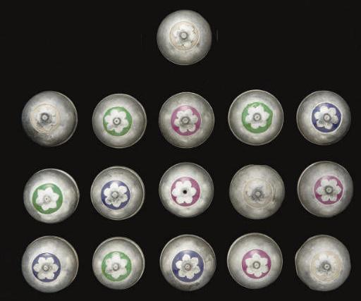 Sixteen silver gaming pieces, India, 18th-19th century, the domes applied with silver floral finial and pink, green, blue and cream enamel tops - largest 1in. (2.7cm) high.