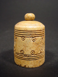 Medieval ivory tan-colored chess piece with concentric circles and lines as decoration. Piece is polished and domed shaped. 11th Century A.D.