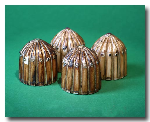 Four Mughal gilt ivory dome-shaped gaming pieces, the body deeply ribbed, gilded and inserted with semi-precious stones, two with crystal inlays, two with garnets. 16th to early 17th century A.D.