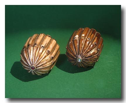 Mughal gilt ivory dome-shaped gaming pieces, the body deeply ribbed, gilded and inserted with semi-precious stones, one with crystal, the second with garnets. 16th to early 17th century A.D.