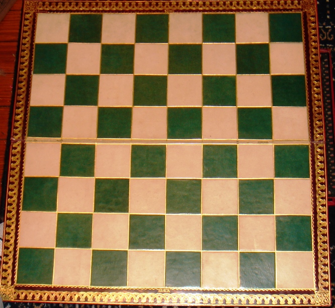 Most Leuchars chessboards have red-and-white squares, but this one has the fairly rare green-and-white squares. Circa 1860.