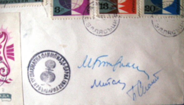 Varna, 1962. First Edition. First Day Cover of the set of 6 Official Stamps and 1 Official Block specialy issued for the Olympiad together with the Official Philatelic Cancels. Signed by three world champions (one then-current, two then-future) -- BOTVINNIK,TAL and SPASSKY.