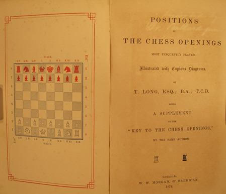 Long (T.): Positions in the Chess Openings most frequently Played. Illustrated with Copious Diagrams. Being a Supplement to the "Key to the Chess Openings." W.W.Morgan, 1874. 1st Edn. Original green cloth. VG. Coloured frontispiece, pp 212, (3) adverts. LN 1813. Uses the novel method of a half-turned piece to indicate the last move played in each diagram. |