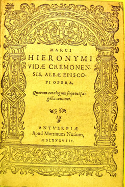 A well-preserved copy of Marci Hieronymi Vidae Cremonensis, 1588. The book was published in two locations in 1588; this one was published in Antwerp.