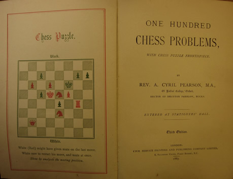 One Hundred Chess Problems, by Rev. A. Cyril Pearson, M.A. Third edition, London 1883. L/N 2444. In original maroon cloth with gilt upper cover. Inscribed by Cyril Pearson to Henry Beckett in 1898.
