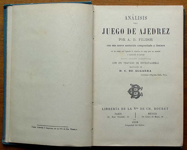 A Spanish edition of Philidor's classic book, "Analysis of the Game of Chess," first published in 1750 (French). This version is from much later, 1898.