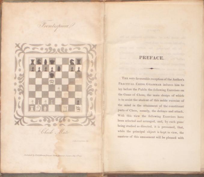 Practical Chess Grammar: or, An Introduction to the Royal Game of Chess: In a Series of Plates. Designed to Instruct the Learner, Remove the Difficulties of this Elegant and Scientific Game, and Render it Attainable by the Lowest Capacity.Printed for T. and J. Allman: London , 1818. William Stopford Kenny (1788-1867) was an accomplished chess player and teacher, as well as the author, editor, or compiler of numerous instructive books, including this popular manual and its companion, Practical Chess Exercises (London , 1818). Unfortunately the title page is missing from the book! |