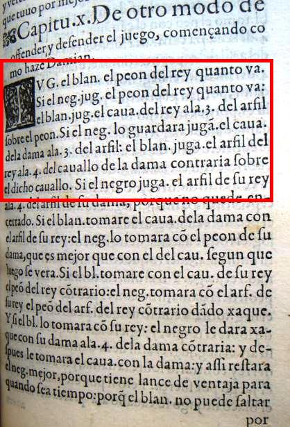 The Ruy López (also called the Spanish Opening) is one of the oldest and most famous openings in chess history, named after Ruy López because of his analysis of this opening in his 1561 book. The photo above shows this original analysis. Roughly translated: The white king's pawn moves two. If black plays the king's pawn two, white plays the king's knight to the 3rd square of the bishop, over the pawn. If black guards by playing the queen's knight to the 3rd square of the bishop: white plays the king's bishop to the 4th square of the aforementioned black Queen's knight. |