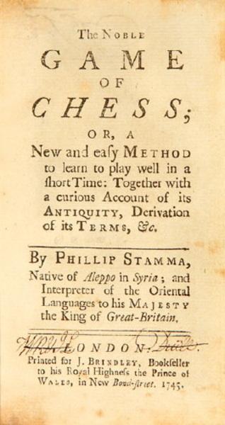 Stamma (Phillip) The Noble Game of Chess, 2 vol Or a new and easy method to play well in a short time: together with a curious account of its Antiquity, Derivation of its terms etc. Printed for J. Brindley, London, 1745. |