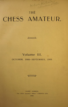 The Chess Amateur, vol. III, October 1908 – September 1909. L/N 6141. viii + 384 pages, with index. Bound in green cloth with gilt spine and gilt upper cover.