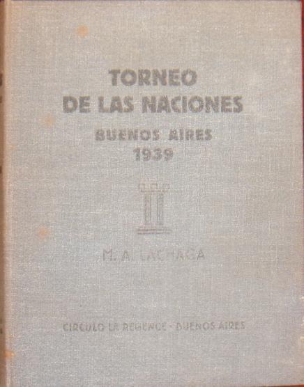 Torneo de Las naciones 1939 by Lachaga limited to 163 copies, autographed by Najdorf. All 1124 games from the tournament are included. Many of the world's best players participated: Alekhine, Capablanca, Keres, Eliskases, Stahlberg, Tartakower, and Najdorf among many masters of world wide fame. I have a chessboard from this famous tournament, autographed by many famous players. |
