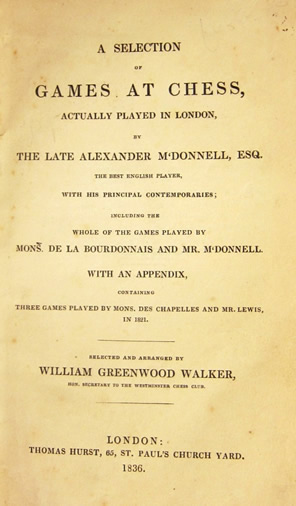 Walker (W.G.): A Selection of Games at Chess, actually Played by the Late Alexander M'Donnell... with his Principal Contemporaries; including the Whole of the Games Played by De La Bourdonnais and M'Donnell....Selected and Arranged by William Greenwood Walker. Thomas Hurst, 1836. 1st Edn. A very scarce book. Numerous games of McDonnell, including many played at odds, 5 from his match with W.Fraser (1831), and 84 from the six matches with La Bourdonnais (1834). An appendix gives the 3 games from match W.Lewis - Deschapelles (1821), and at end is a 3 page List of Subscribers. William Walker was secretary of the Westminster Chess Club and personally recorded most of McDonnell's games, including the great match series with La Bourdonnais. LN 3144. |