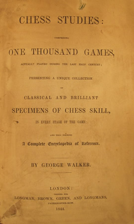 'Chess Studies: Comprising One Thousand Games, actually played during the last half century; presenting a unique collection of classical and brilliant specimens of chess skills, in every stage of the game', by George Walker. London, 1844. 172 pages. L/N 3145. Recently bound in purple cloth, with gilt ticket to spine.