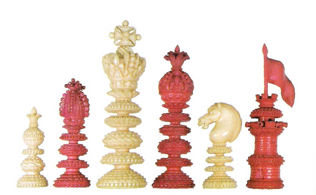 This set is one of two patterns that are often referred to as a "Hastilow" pattern, after Charles Hastilow, who was one of the top ivory carvers in the mid 1800's. However, these sets are unattributed. The Kings are 5" tall. |