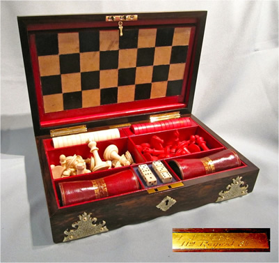 A games compendium manufactured and sold by J.J. Mechi, a well-known merchant in Victorian London. Mechi was also the founder of the Royal Agricultural Beneficial Institution. The chess set is a Staunton pattern bone set, kings 2.35 inches. The compendium can be dated to the 1870's, partly due to the address (112 Regent street) and partly because his earlier items at that address were labeled Mechi & Bazin. Bazin died in 1865 but the company traded under that name until 1869. (Thanks to my friend Helen Murphy, the top Mechi researcher, for this information.) |