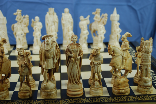 A "Field of the Cloth of Gold" themed set, with King Henry VIII versus Francis I. The Queens also have historically accurate resemblances to Catherine of Aragon and Queen Claude. The Field of the Cloth of Gold or Camp du Drap d'Or is the name given to a place in Balinghem, between Guînes and Ardres, in France, near Calais, that was the site of a meeting that took place from 7 June to 24 June 1520, between King Henry VIII of England and King Francis I of France. [Wikipedia] King size 12.7 cm. The carving has excellent character and is now also included in my webpage Jon's Favorite Sets. Picasa album with photos of this set: http://tinyurl.com/l2gxxcy |