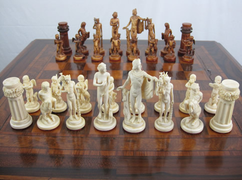 This German figural ivory set was probably carved in Erbach circa 1900. The figures represent mythological people and creatures. King size 9.2 cm.
