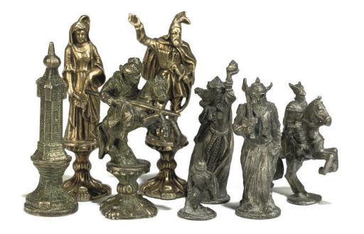 German Silvered and Gilt Bronze Figural Chess Set, early 20th century, depicting the Prussians versus the Cossaks, the pieces marked to the underside M.K.W ELZHOLZ.