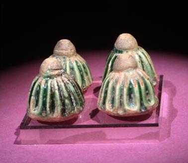 Four Kashan Ceramic Chess Pieces, Persia, c. 11th-12th Century A.D. Size: 2.8 cm H - 1 1/8”. Dome shaped, ribbed surface, knob at the top, glazed in turquoise and green.
