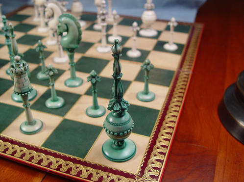 The Turkish Style set situated on an antique Leuchars chessboard, circa 1860.
