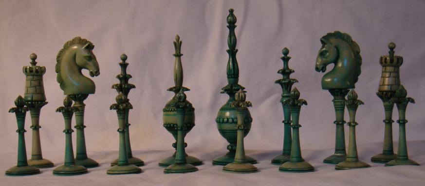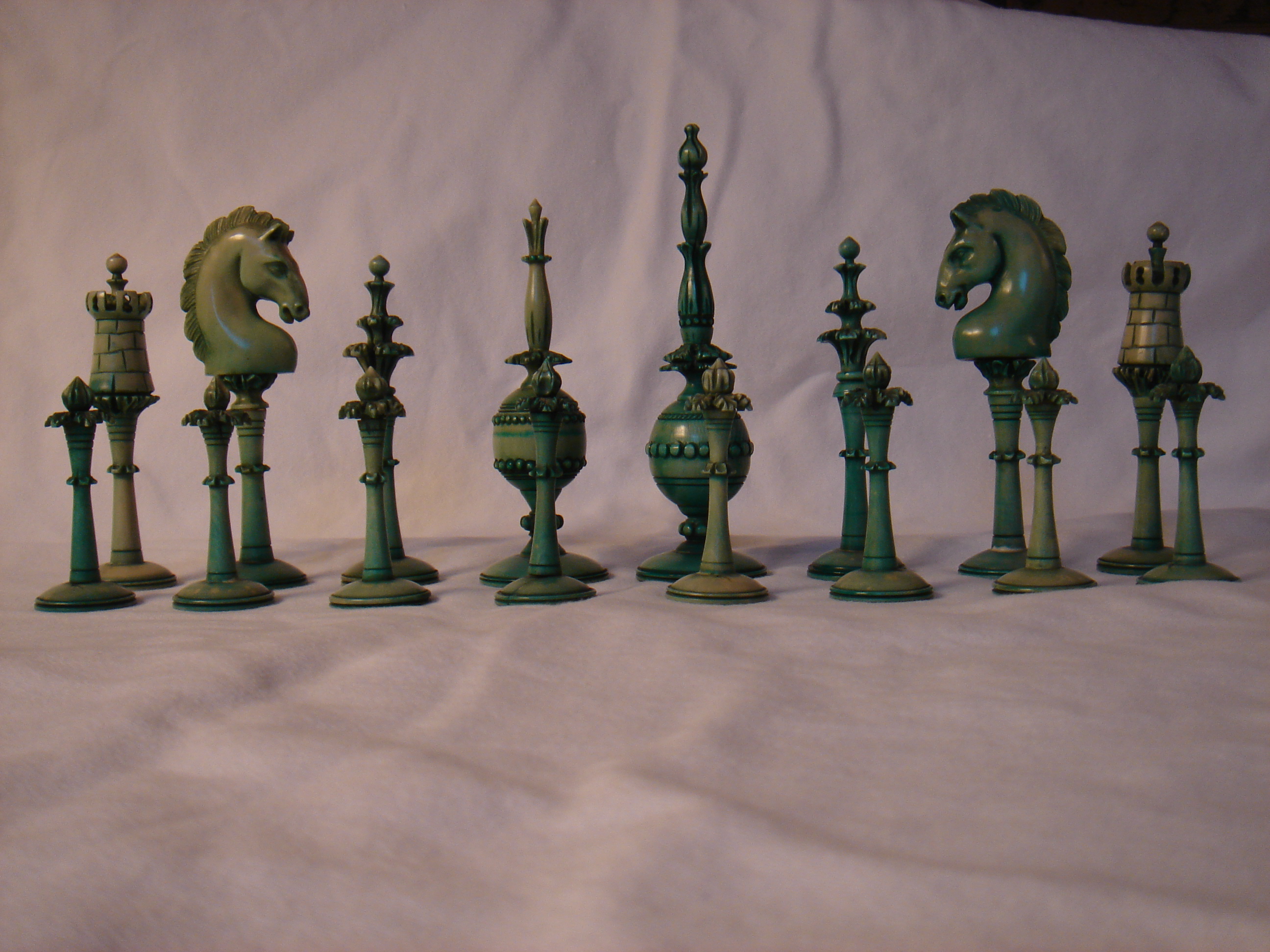 Turkish Style Carved Ivory Chess Set - Green Pieces