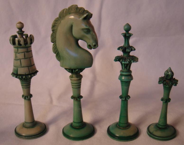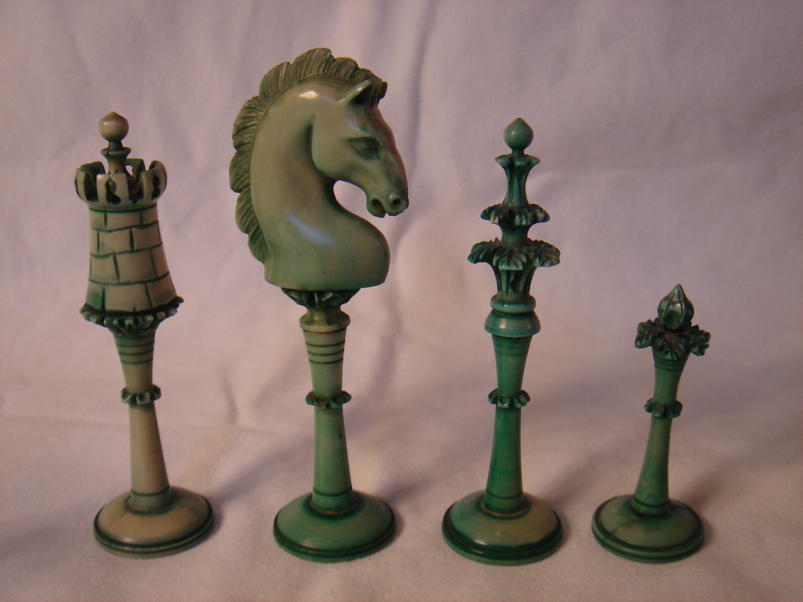 Turkish Style Carved Ivory Chess Set - Green Rook, Knight, Bishop, Pawn