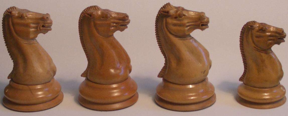 An interesting comparison of four Jaques Knights, all from sets circa 1849 - the first year of manufacture. The three club-sized knights are in chronological order, from earliest to latest.