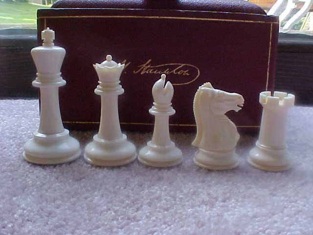 A small Jaques ivory set, Marshall style Knights, in the rare red trolley casket. Early 20th century.