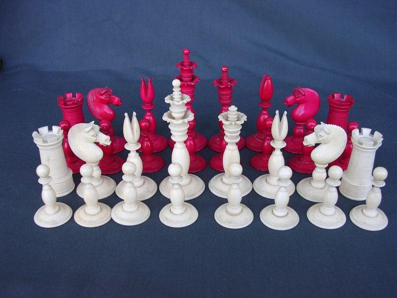 A small unstamped ivory set. This pattern of set is known as the Calvert pattern, but I refer to it as the "Calvert early" pattern to distinguish it from another type of set that was made by the Calverts. The knights in this set appear to me to be definitive Merrifield knights, and my opinion is that this particular set was made by Merrifield. I have another similar style set in a stamped Merrifield box.
