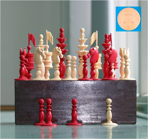 A rare "early Calvert" pattern set with triple fountains, with the familiar Fisher 188 Strand stamp on the King's underside. Unfortunately one white knight was inexplicably lost during the shipping process. |