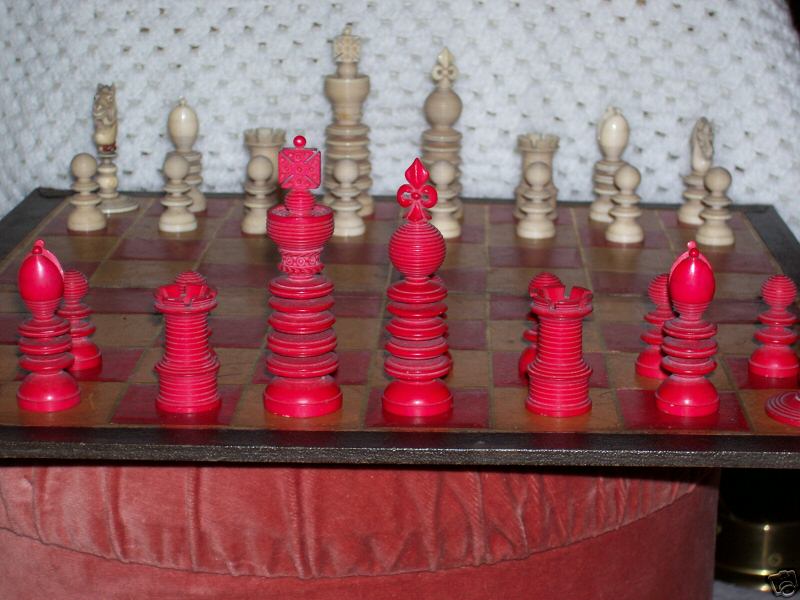 A Lund set with 3.5" Kings. Two of the knights are replacements. The outstanding feature of this set, in addition to the Lund stamp on the White King, is the rare paper label on the bottom of the Red King. These paper labels did not typically last long, and only a few examples are extant today.