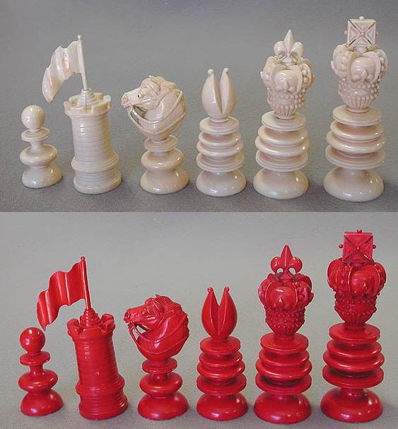 Click here for some detailed photos of this set A Charles Hastilow style set with exquisite carving, especially the Knights. Mid 19th century. It is unclear who the manufacturer actually was, because Charles Hastilow did not stamp or mark his sets. I know of only one set that is fully attributed to Charles Hastilow -- a large Barleycorn set elsewhere in my collection, which was acquired from the Hastilow family. Click here for my Picasa album with photos of this set |
