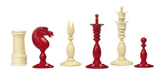 A "Calvert style" ivory chess set, English, circa 1860, one side stained red, the other side left natural, kings with double pierced galleries, queens with single pierced galleries, bishops with open mitres, knights as carved horses' heads with manes, rooks as turrets with battlements, pawns with baluster knop finials, the king 7.6cm high, the pawn 3.8cm high. Based on the carved knightheads and other features, I can state with confidence that this set was manufactured by George Merrifield. |